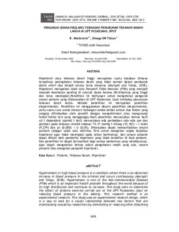 Mutiaranti, R. and Tahun, Omega DR (2023) Pengaruh senam prolanis terhadap penurunan tekanan darah lansia di UPT Puskesmas Jiput. Manuju : Malahayati Nursing Journal, 5 (5): 28. pp. 1606-1613. ISSN 2655-2728