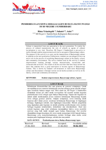 Rima, Trianingsih and Sulastri, Sulastri and Asini, Asini (2022) Pemberdayaan siswa sebagai agen budaya Banyuwangi di SD Negeri 1 Sumberbaru. Dedikasi Nusantara: Jurnal Pengabdian Masyarakat Pendidikan Dasar, 2 (1): 8. pp. 53-62. ISSN 2798-172X
