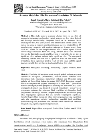 Teguh, Erawati and Maria, Kristianti Rika Nahak (2023) Struktur modal dan nilai perusahaan manufaktur di Indonesia. Jurnal Simki Economic, 6 (1): 6. pp. 53-59. ISSN 2599-0748