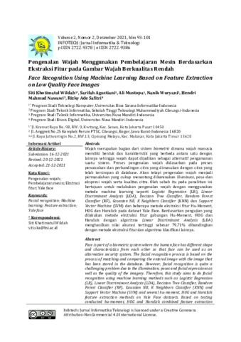 Siti, Khotimatul Wildah and Sarifah, Agustiani and Ali, Mustopa and Nanik, Wuryani and Hendri, Mahmud Nawawi and Rizky, Ade Safitri (2021) Pengenalan wajah menggunakan pembelajaran mesin berdasarkan ekstraksi fitur pada gambar wajah berkualitas rendah. Infotech: Jurnal Informatika & Teknologi, 2 (2): 4. pp. 93-101. ISSN 2722-9386