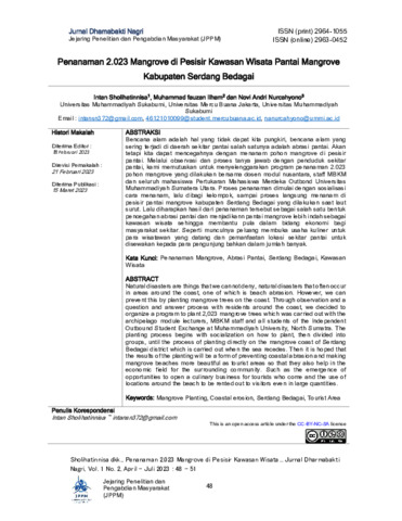 Sholihatinnisa, Intan and Ilham, Muhammad Fauzan and Nurcahyono, Novi Andri (2023) Penanaman 2.023 mangrove di pesisir kawasan wisata Pantai Mangrove Kabupaten Serdang Begadai. Jurnal Dharmabakti Nagri, 1 (2): 1. pp. 48-51. ISSN 2964-1055
