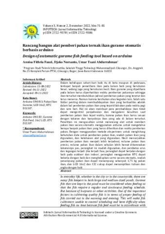Annisa, Fithria Fauzi and Djoko, Nursanto and Umar, Tsani Abdurrahman (2022) Rancang bangun alat pemberi pakan ternak ikan gurame otomatis berbasis arduino. Infotech: Jurnal Informatika & Teknologi, 3 (2): 2. pp. 71-81. ISSN 2722-9386