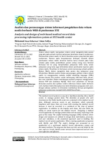 Mohamad, Anas Sobarnas and Intan, Sofiya (2022) Analisis dan perancangan sistem informasi pengolahan data rekam medis berbasis WEB di puskesmas XYZ. Infotech: Jurnal Informatika & Teknologi, 3 (2): 3. pp. 82-91. ISSN 2722-9386