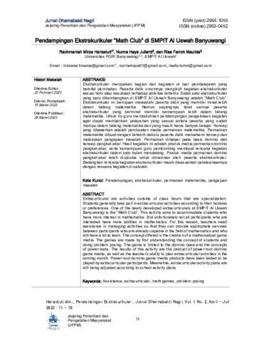 Hariastuti, Rachmaniah Mirza and Juliati, Nurma Haya and Maulida, Risa Farroh (2023) Pendampingan ekstrakurikuler "Math Club" di SMPIT Al Uswah Banyuwangi. Jurnal Dharmabakti Nagri, 1 (2): 5. pp. 71-79. ISSN 2964-1055