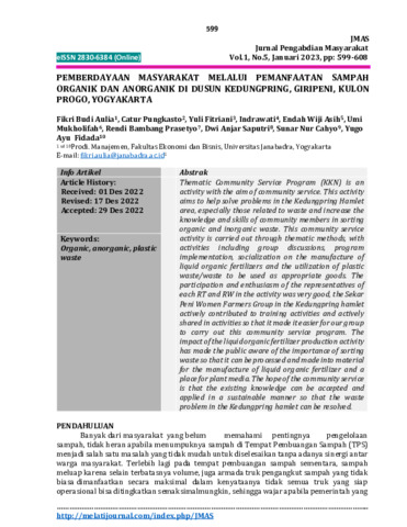 Fikri Budi, Aulia and Catur, Pungkasto and Yuli, Fitriani and Indrawati, Indrawati and Endah Wiji, Asih and Umi, Mukholifah and Rendi Bambang, Prasetyo and Dwi Anjar, Saputri and Sunar Nur, Cahyo and Yugo Ayu, Fidada (2023) Pemberdayaan masyarakat melalui pemanfaatan sampah organik dan anorganik di Dusun Kedungpring, Giripeni, Kulon Progo, Yogyakarta. Jurnal Pengabdian Masyarakat (J-Mas), 1 (5): 17. pp. 599-608. ISSN 2830-6384