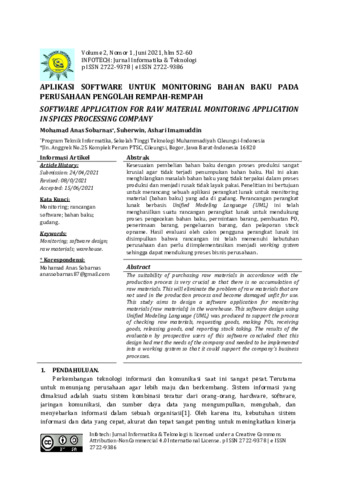 Mohamad, Anas Sobarnas and Suherwin, Suherwin and Ashari, Imamuddin (2021) Aplikasi software untuk monitoring bahan baku pada perusahaan pengolah rempah-rempah. Infotech: Jurnal Informatika & Teknologi, 2 (1): 6. pp. 52-60. ISSN 2722-9386