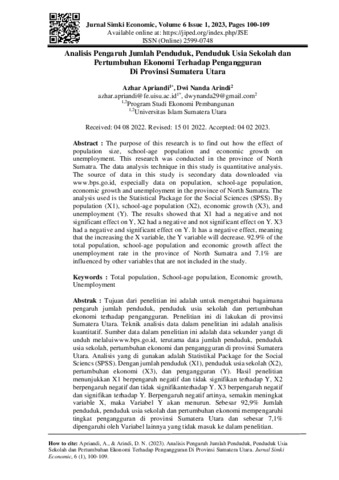 Azhar, Apriandi and Dwi, Nanda Arindi (2023) Analisis pengaruh jumlah penduduk, penduduk usia sekolah dan pertumbuhan ekonomi terhadap pengangguran di Provinsi Sumatera Utara. Jurnal Simki Economic, 6 (1): 11. pp. 100-109. ISSN 2599-0748