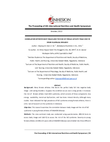 Utari, Diajeng Isti and Muslichah, Rahadyana and Penggalih, Mirza Hapsari Sakti Titis and Sofro, Zaenal Muttaqien (2022) Correlation between body image and the risk of female athlete triad (fat) IN SMAN Olahraga Sidoarjo. In: The Proceeding of 6th International Nutrition and Health Symposium, October, 2022.