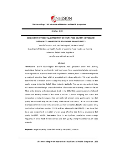 Aini, Nazulfa Quro’atul and Budiningsari, Dwi and Palupi, Ika Ratna (2022) Correlation between usage frequency of online food delivery services and diet quality among Universitas Gadjah Mada students. In: The Proceeding of 6th International Nutrition and Health Symposium, October, 2022.