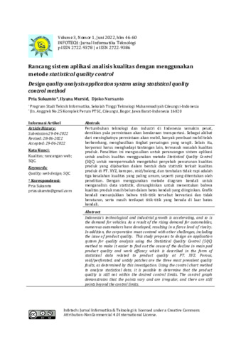 Pria, Sukamto and Ilyana, Mursid and Djoko, Nursanto (2022) Rancang sistem aplikasi analisis kualitas dengan menggunakan metode statistical quality control. Infotech: Jurnal Informatika & Teknologi, 3 (1): 6. pp. 46-60. ISSN 2722-9386