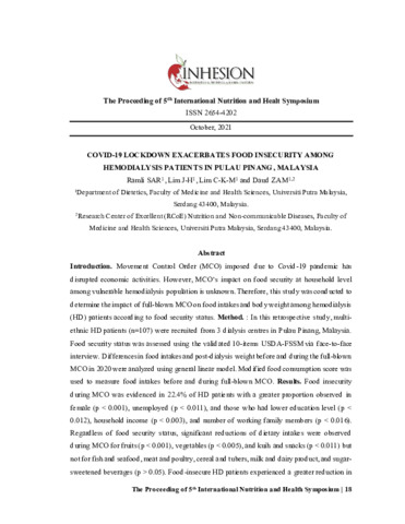 SAR, Ramli and J-H, Lim and C-K-M, Lim and ZAM, Daud (2021) Covid-19 lockdown exacerbates food insecurity among hemodialysis patients in Pulau Pinang, Malaysia. The Proceeding of International Nutrition and Health Symposium, 5: 2. pp. 18-31. ISSN 2654-4202