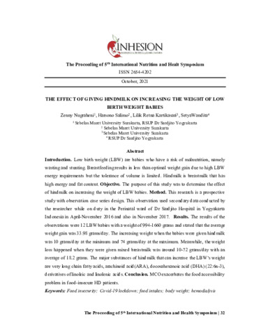 Nugraheni, Zenny and Salimo, Harsono and Kartikasari, Lilik Retna and Wandita, Setya (2021) The effect of giving hindmilk on increasing the weight of low birth weight babies. The Proceeding of International Nutrition and Health Symposium, 5: 3. pp. 32-38. ISSN 2654-4202