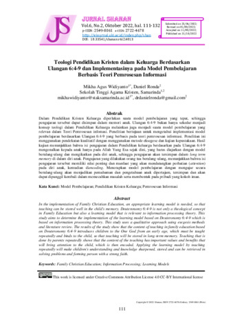 Mikha Agus, Widiyanto and Daniel, Ronda (2022) Teologi pendidikan kristen dalam keluarga berdasarkan Ulangan 6:4-9 dan implementasinya pada model pembelajaran berbasis teori pemrosesan informasi. Jurnal Shanan, 6 (2): 1. pp. 111-132. ISSN 2549-8061