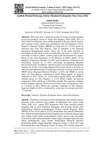 Jalilah, Ilmiha (2023) Analisis potensi beberapa sektor ekonomi Kabupaten Nias Utara 2022. Jurnal Simki Economic, 6 (1): 13. pp. 124-133. ISSN 2599-0748