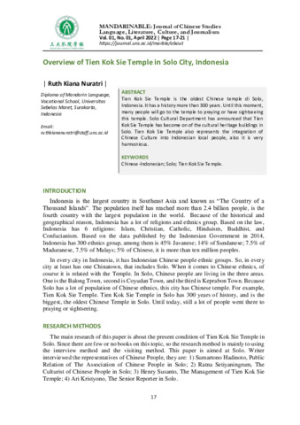Ruth, Kiana Nuratri (2022) Overview of Tien Kok Sie Temple in Solo City, Indonesia. Mandarinable: Journal of Chinese Studies, 1 (1): 3. pp. 17-21. ISSN 2962-424X