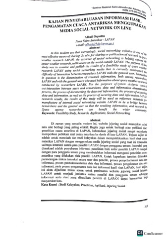 Di zaman yang semakin modern ini, website jejaring sosial merupakan salah satu alat berbagi yang paling efektif. Begitu juga untuk berbagi atau publikasi riset penelitian cuaca antariksa di LAPAN, keberadaan jejaring sosial sangat membantu memperluas publikasi riset cuaca antariksa ke dunia di luar LAPAN. Tujuan kajian ini adalah untuk menelaah dan studi kelayakan dalam mempublikasikan hasil riset cuaca antariksa LAPAN dengan menggunakan media jejaring sosial yang saat ini terkendala sulitnya interaksi antara para peneliti LAPAN dengan pengguna umum. Interaksi yang dimaksud adalah penyebaran informasi penelitian baik antar peneliti LAPAN maupun dengan para pengguna umum yang membutuhkan informasi mengenai penelitian cuaca antariksa yang dilakukan oleh peneliti LAPAN. Untuk keperluan tersebut dilakukan perancangan sistem interaksi antara user dan peneliti, proses penyebarluasan data dan informasi, proses pendokumentasian data dan informasi, proses pengaksesan data dan informasi, serta proses pengamanan data dan informasi hasil riset LAPAN, hasil kajian ini akan dijadikan bahan acuan untuk pembuatan website jejaring sosial internal LAPAN untuk menjadi jembatan antara peneliti dan pengguna umum sehingga informasi serta riset yang dihasilkan peneliti di LAPAN dapat bermanfaat bagi masyarakat luas.