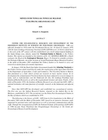 Since then LON-LIPI has developed, and established two oceanological stations. The first one was the Ambon Research Station, situated on the Ambon Bay in the Mottucas, established in 1973. The second one was the Pulau Pari Oceanological Station in the Bay of Jakarta which was established in 1976. The following is the history of LON - LIPI from its first foundation in the Midst of December 1905 until the Midst of December 1985, based on an intensive literature study supported by personal notes and experiences as well as personal communication with the staffs. Through the reorganization of LIPI, the National Institute of Oceanology (LON-LIPI) in 1986 became Pusat Penelitian dan Pengembangan Oseanologi or the Centre for Oceanological Research and Development.