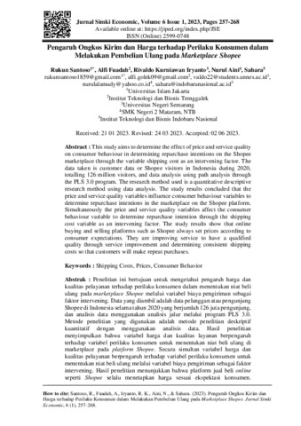 Rukun, Santoso and Alfi, Fuadah and Rivaldo Kurniawan, Iryanto and Nurul, Aini and Sahara, Sahara (2023) Pengaruh ongkos kirim dan harga terhadap perilaku konsumen dalam melakukan pembelian ulang pada Marketplace Shopee. Jurnal Simki Economic, 6 (1): 25. pp. 257-268. ISSN 2599-0748