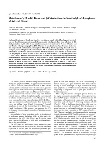 substitutions and 33 were missense mutations. Nineteen mutations were detected in exon 5 and/or 7 of the p53 gene in nine of 17 cases (52.9%) and 21 in exon 11 and/or 17 of the c-kit gene in 10 of 14 cases (71.4%). Bilateral adrenal lesions in one case who had not received any adjuvant therapy showed different mutational patterns of the p53 and c-kit genes, suggesting different clonal evolution of lymphoma between the left and right sides. Mutation at codon 13 of the K-ras gene was detected in one of 14 cases (7.1%), and in exon 3 of the β-catenin gene in three of 12 cases (25%). All but one mutation were transition mutations, indicating that some endogenous mutagens act in
