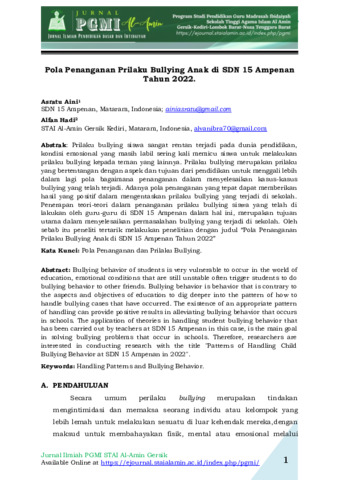 Asratu, Aini and Alfan, Hadi (2022) Pola penanganan prilaku bullying anak di SDN 15 Ampenan tahun 2022. Jurnal Pendidikan Guru Madrasah Ibtidaiyah Al-Amin, 1 (1): 1. pp. 1-13. ISSN 2986-0946