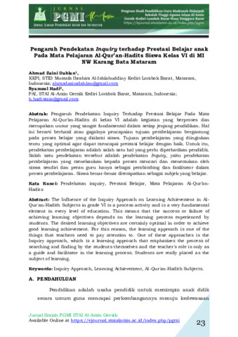 Ahmad, Zaini Dahlan and Syamsul, Hadi (2022) Pengaruh pendekatan Inquiry terhadap prestasi belajar anak pada mata pelajaran Al-Qur’an-Hadits siswa kelas VI di MI NW Karang Bata Mataram. Jurnal Pendidikan Guru Madrasah Ibtidaiyah Al-Amin, 1 (1): 3. pp. 23-33. ISSN 2986-0946