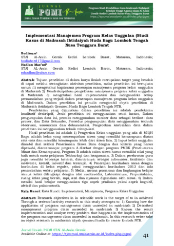 Budiman, Budiman and Hadlun, Mas’ud (2022) Implementasi manajemen program kelas unggulan (Studi kasus di Madrasah Ibtidaiyah Huda Bagu Lombok Tengah Nusa Tenggara Barat. Jurnal Pendidikan Guru Madrasah Ibtidaiyah Al-Amin, 1 (1): 5. pp. 41-52. ISSN 2986-0946
