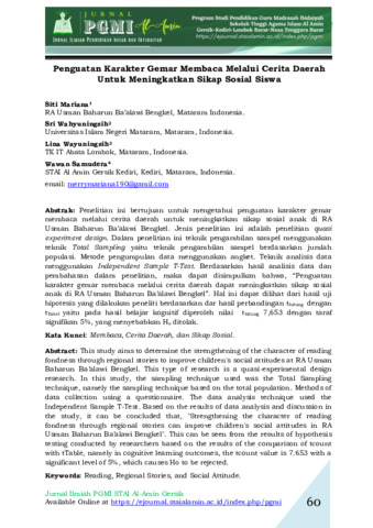 Siti, Mariana and Sri, Wahyuningsih and Lina, Wayuningsih and Wawan, Samudera (2022) Penguatan karakter gemar membaca melalui cerita daerah untuk meningkatkan sikap sosial siswa. Jurnal Pendidikan Guru Madrasah Ibtidaiyah Al-Amin, 1 (1): 7. pp. 60-69. ISSN 2986-0946