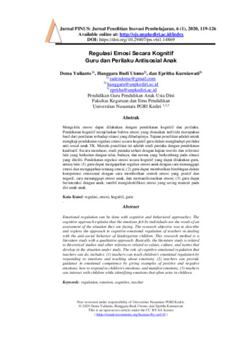Dema, Yulianto and Hanggara, Budi Utomo and Epritha, Kurniawati (2020) Regulasi emosi secara kognitif guru dan perilaku antisosial anak. PINUS: Jurnal Penelitian Inovasi Pembelajaran, 6 (1): 6. pp. 119-126. ISSN 2621-2390