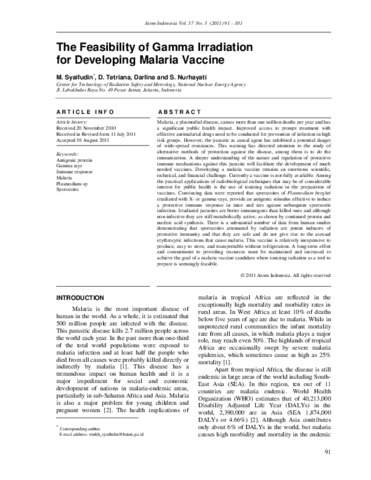 Mukh, Syaifudin and Devita, Tetriana and Darlina, Darlina and Siti, Nurhayati (2011) The Feasibility of Gamma Irradiation for Developing Malaria Vaccine. Atom Indonesia, 37 (3). pp. 91-101. ISSN 0126-1568
