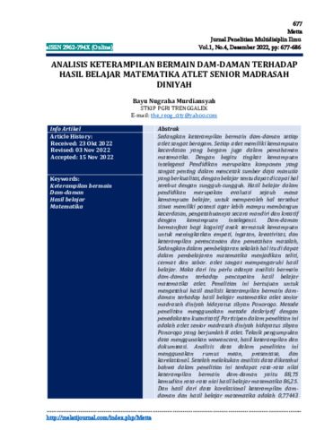 Bayu, Nugraha Murdiansyah (2022) Analisis keterampilan bermain dam-daman terhadap hasil belajar matematika atlet senior Madrasah Diniyah. Metta Jurnal Penelitian Multidisiplin Ilmu, 1 (4): 1. pp. 677-686. ISSN 2962-794X