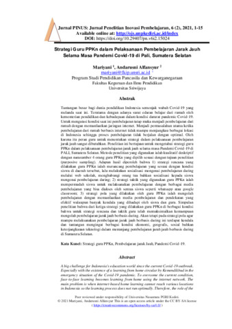 Mariyani, Mariyani and Andarusni, Alfansyur (2021) Strategi guru PPKn dalam pelaksanaan pembelajaran jarak jauh selama masa pandemi Covid-19 di Pali, Sumatera Selatan. PINUS: Jurnal Penelitian Inovasi Pembelajaran, 6 (2): 1. pp. 1-15. ISSN 2621-2390