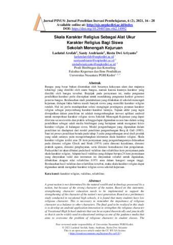 Laelatul, Arofah and Santy, Andrianie and Restu, Dwi Ariyanto (2021) Skala karakter religius sebagai alat ukur karakter religius bagi siswa sekolah menengah kejuruan. PINUS: Jurnal Penelitian Inovasi Pembelajaran, 6 (2): 2. pp. 16-28. ISSN 2621-2390