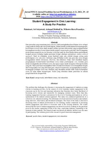 Patmisari, Patmisari and Sri, Setyawati and Achmad, Muthali’in and Wibowo, Heru Prasetiyo (2021) Student engagement in civic learning: A study for practice. PINUS: Jurnal Penelitian Inovasi Pembelajaran, 6 (2): 3. pp. 28-43. ISSN 2621-2390