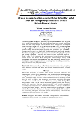 Program pendidikan untuk siswa dengan retardasi mental menekankan pada persiapan siswa untuk hidup mandiri setelah selesai sekolah. Salah satu strategi pendidikan untuk anak dan remaja dengan retardasi mental adalah mengajarkan keterampilan hidup sehari-hari. Tujuan studi ini adalah untuk melakukan review literatur mengenai strategi mengajarkan keterampilan hidup sehari-hari untuk anak dan remaja dengan retardasi mental. Pencarian literatur dilakukan pada tujuh basis data, yaitu ERIC, SpringerLink, Science Direct, SAGE, JSTOR, Emerald Insight dan Google Schoolar. Kata kunci yang digunakan dalam pencarian ini adalah “teaching daily living skill” and “mental retardation”; “teaching daily living skill” and “intellectual disability”.Total 5 artikel (N=614) akan direview dengan melalui proses skrining berdasarkan kriteria inklusif dan eklusif. Hasil menunjukkan bahwa terdapat strategi untuk mengajarkan keterampilan hidup sehari-hari pada anak dan remaja dengan retardasi mental yaitu dengan menggunakan video prompting, video modelling, constant-timedelay dan most-to-least prompt procedures.