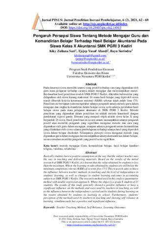 Kiky, Zuliana Sari and Tjejep, Yusuf Afandi and Bayu, Surindra (2021) Pengaruh persepsi siswa tentang metode mengajar guru dan kemandirian belajar terhadap hasil belajar akuntansi pada siswa kelas X Akuntansi SMK PGRI 3 Kediri. PINUS: Jurnal Penelitian Inovasi Pembelajaran, 6 (2): 6. pp. 62-69. ISSN 2621-2390