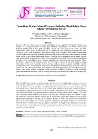 Nofri Isabela, Bano and Wiyun Philipus, Tangkin (2022) Peran guru Kristen sebagai penuntun terhadap minat belajar siswa selama pembelajaran daring. Jurnal Shanan, 6 (2): 11. pp. 313-330. ISSN 2549-8061