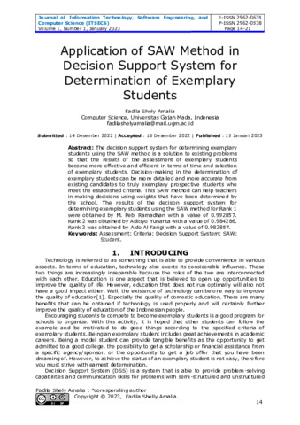Fadila, Shely Amalia (2023) Application of SAW method in decision support system for determination of exemplary students. Journal of Information Technology, Software Engineering and Computer Science, 1 (1): 3. pp. 14-21. ISSN 2962-0538
