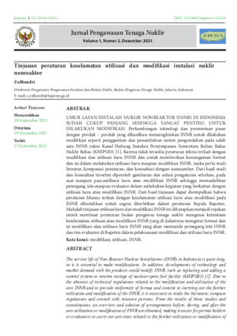 Perkembangan teknologi dan permintaan pasar dengan produk – produk yang dihasilkan memungkinkan INNR untuk dilakukan modifikasi seperti penggantian dan penambahan sistem pengendalian pada salah satu INNR yakni Kanal Hubung Instalasi Penyimpanan Sementara Bahan Bakar Nuklir Bekas (KHIPSB3) [1]. Karena tidak tersedia peraturan teknis terkait dengan modifikasi dan utilisasi baru INNR dan untuk memberikan keseragaman format dan isi dalam melakukan utilisasi baru maupun modifikasi INNR, maka perlu studi literatur, komparasi peraturan, dan konsultasi dengan narasumber. Dari hasil studi dan konsultasi tersebut diperoleh gambaran dan solusi pengaturan sebelum, pada saat maupun pasca utilisasi baru atau modifikasi INNR sehingga memudahkan pemegang izin ataupun evaluator dalam melakukan kegiatan yang berkaitan dengan utilisasi baru atau modifikasi INNR. Dari hasil tinjauan dapat disimpulkan bahwa peraturan khusus terkait dengan keselamatan utilisasi baru atau modifikasi pada INNR dibutuhkan untuk segera diterbitkan dalam peraturan Kepala Bapeten.Makalah tinjauan utilisasi baru dan modifikasi INNR ini diharapkan menjadi rujukan untuk membuat peraturan badan pengawas tenaga nuklir mengenai ketentuan keselamatan utilisasi atau modifikasi INNR yang di dalamnya mengatur format dan isi modifikasi atau utilisasi baru INNR yang akan memandu pemegang izin INNR dan tim evaluator di Bapeten dalam pelaksanaan modifikasi dan utilisasi baru INNR.