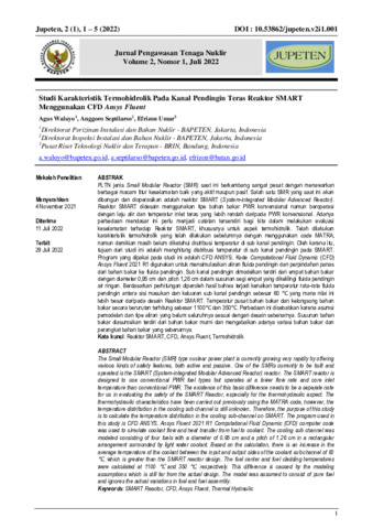 1 Agus, Waluyo and Anggoro, Septilarso and Efrizon, Umar (2022) Studi karakteristik termohidrolik pada kanal pendingin teras Reaktor SMART menggunakan CFD Ansys Fluent. Jurnal Pengawasan Tenaga Nuklir, 2 (1): 1. pp. 1-5. ISSN 2798-513X