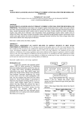 Telah dilakukan suatu kajian awal mengenai regulasi keselamatan terkait sumber yatim pada industri besi bekas. Kajian dilakukan dengan membahas potensi sumber yatim yang tidak disengaja bercampur dengan besi bekas, standar internasional terkait sumber yatim di industri besi bekas, kondisi industri besi bekas di Indonesia, regulasi yang sudah ada di Indonesia serta rekomendasi dalam pengembangan regulasi terkait sumber yatim di industri besi bekas. Dari kajian ini dapat disimpulkan bahwa diperlukan pengembangan regulasi keselamatan terkait sumber yatim pada industri besi bekas di Indonesia mengingat besarnya kontribusi besi bekas sebagai bahan baku utama dalam industri daur ulang logam di Indonesia.