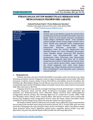 Indyah, Hartami Santi and Firsta, Rahmania Sucahyo (2022) Perancangan sistem marketplace berbasis web menggunakan framework laravel. Metta Jurnal Penelitian Multidisiplin Ilmu, 1 (4): 7. pp. 743-756. ISSN 2962-794X