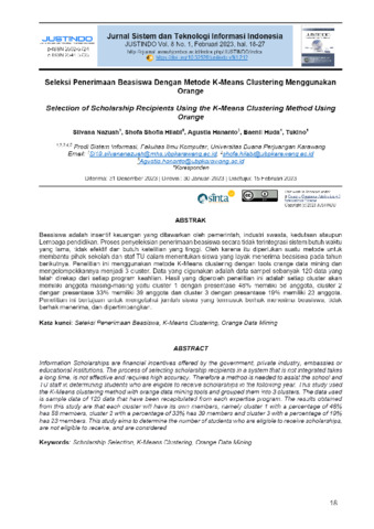Silvana, Nazuah and Shofa, Shofia Hilabi and Agustia, Hananto and Baenil, Huda and Tukino, Tukino (2023) Seleksi penerimaan beasiswa dengan metode k-means clustering menggunakan orange. Justindo (Jurnal Sistem dan Teknologi Informasi Indonesia), 8 (1): 3. pp. 18-27. ISSN 2502-5724