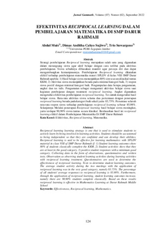 Abdul Muis and Dimas Anditha Cahyo Sujiwo and Trio Suwargono (2022) Efektivitas reciprocal learning dalam pembelajaran matematika di SMP Darur Rahmah. Gammath : Jurnal Ilmiah Program Studi Pendidikan Matematika, 7 (2): 7. pp. 124-132. ISSN 2541-2612