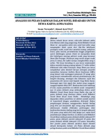 Imam, Turmudzi and Ahmad, Asrof Fitri (2022) Analisis isi pesan dakwah dalam novel Bidadari untuk Dewa karya Asma Nadia. Metta Jurnal Penelitian Multidisiplin Ilmu, 1 (4): 12. pp. 795-804. ISSN 2962-794X