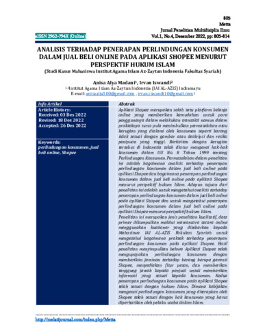 Anisa Alya, Madani and Irvan, Iswandi (2022) Analisis terhadap penerapan perlindungan konsumen dalam jual beli online pada aplikasi shopee menurut perspektif hukum islam (studi kasus mahasiswa Institut Agama Islam Az-Zaytun Indonesia Fakultas Syariah). Metta Jurnal Penelitian Multidisiplin Ilmu, 1 (4): 13. pp. 805-814. ISSN 2962-794X