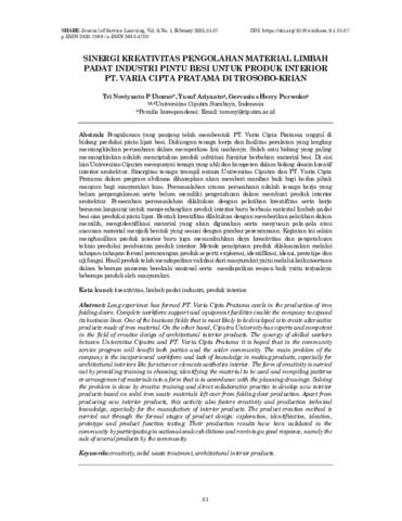 Utomo, Tri Noviyanto P and Ariyanto, Yusuf and Purwoko, Gervasius Herry (2023) Sinergi kreativitas pengolahan material limbah padat industri pintu besi untuk produk interior PT. Varia Cipta Pratama di Trosobo-Krian. SHARE: Journal of Service-Learning, 9 (1): 11. pp. 81-87. ISSN 2338-7866