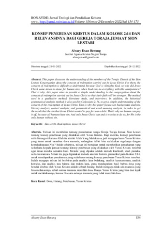 Alvary Exan, Rerung (2022) Konsep penebusan Kristus dalam Kolose 2:14 dan relevansinya bagi gereja Toraja jemaat Sion Lestari. BONAFIDE: Jurnal Teologi dan Pendidikan Kristen, 3 (2): 2. pp. 154-173. ISSN 2722-4473