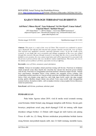 Adi, Putra and Filmon, Berek and Yane, Keluanan and Sri Dwi, Harti and Gunar, Sahari and Charisal, Manu and Nurliani, Siregar (2022) Kajian teologis terhadap salib Kristus. BONAFIDE: Jurnal Teologi dan Pendidikan Kristen, 3 (2): 4. pp. 193-210. ISSN 2722-4473