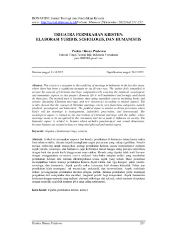Paulus Dimas, Prabowo (2022) Trigatra pernikahan Kristen: Elaborasi yuridis, sosiologis, dan humanistis. BONAFIDE: Jurnal Teologi dan Pendidikan Kristen, 3 (2): 5. pp. 211-231. ISSN 2722-4473