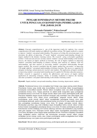 Fernando, Christofer and Wahyu, Irawati (2022) Pengaruh penerapan metode inkuiri untuk penguasaan konsep pada pembelajaran Pak jarak jauh. BONAFIDE: Jurnal Teologi dan Pendidikan Kristen, 3 (2): 6. pp. 232-251. ISSN 2722-4473